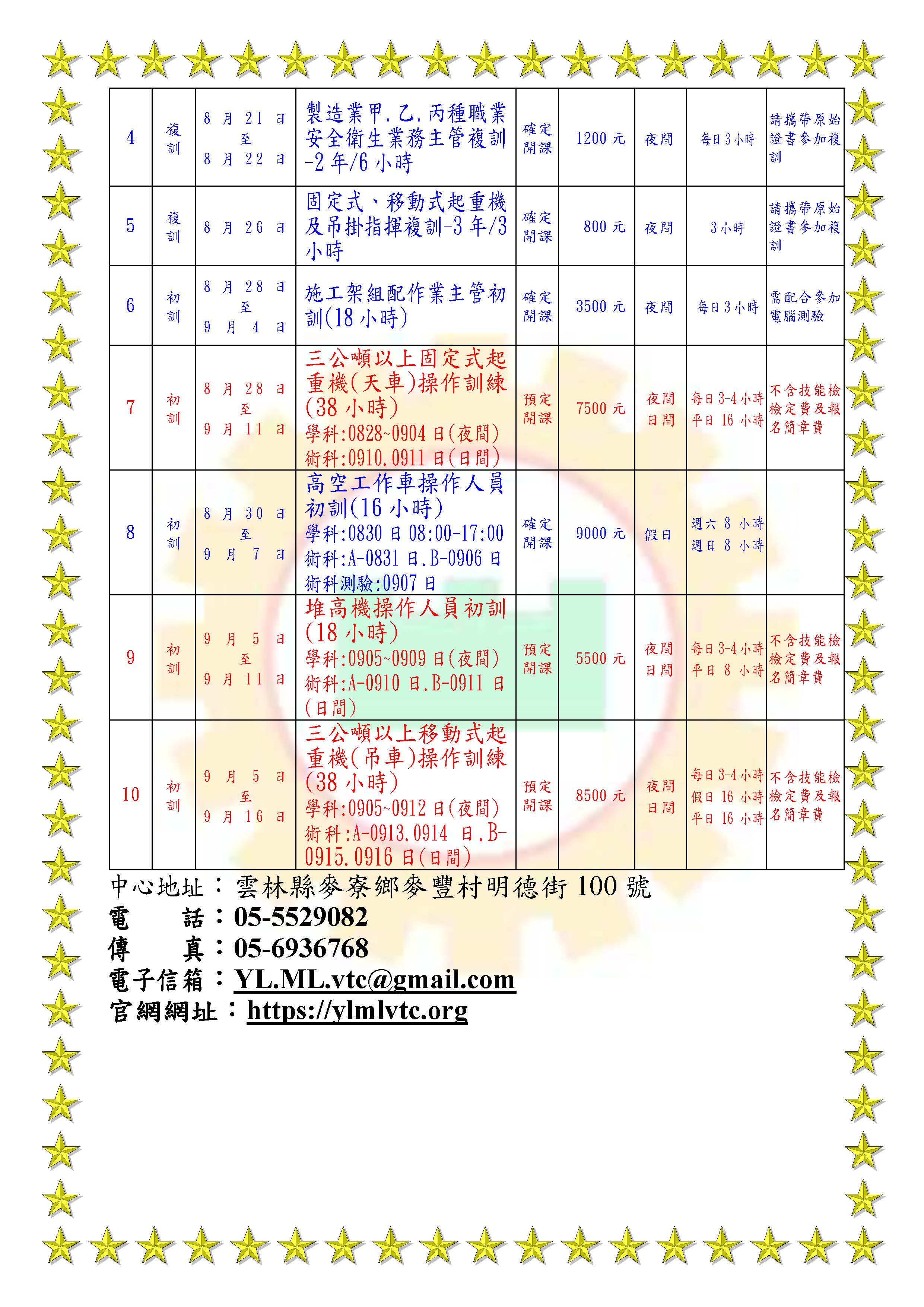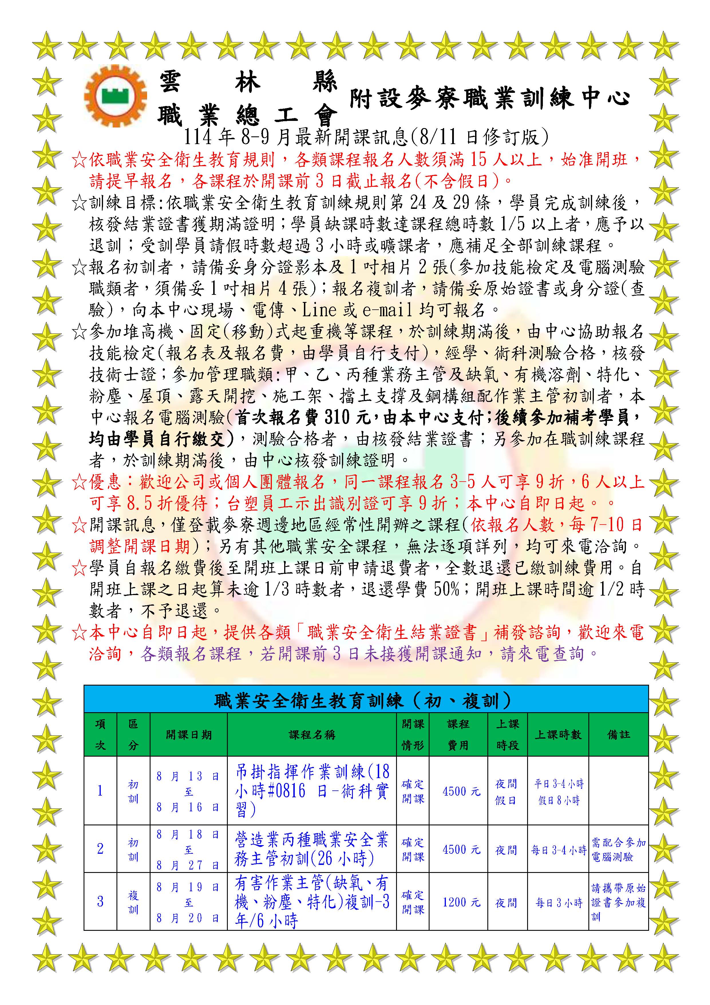 Category: 中心消息By 麥寮 職業訓練中心2025-08-11 Author: 麥寮 職業訓練中心 Post navigationPreviousPrevious post:職訓中心位置NextNext post:開課訊息Related posts開課訊息2025-09-24113年講師徵選2023-12-01「鋼構組配作業主管」及「模板支撐作業主管」自112年9月1日起改採電腦測驗!2023-05-31本中心已通過勞動部核准辦理「高空工作車操作人員」訓練班!!2023-03-15「擋土支撐作業主管」自111年7月1日起改採電腦測驗2022-04-27勞動部修正發布「職業安全衛生教育訓練規則」2021-07-19